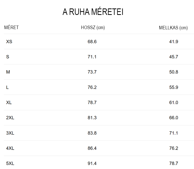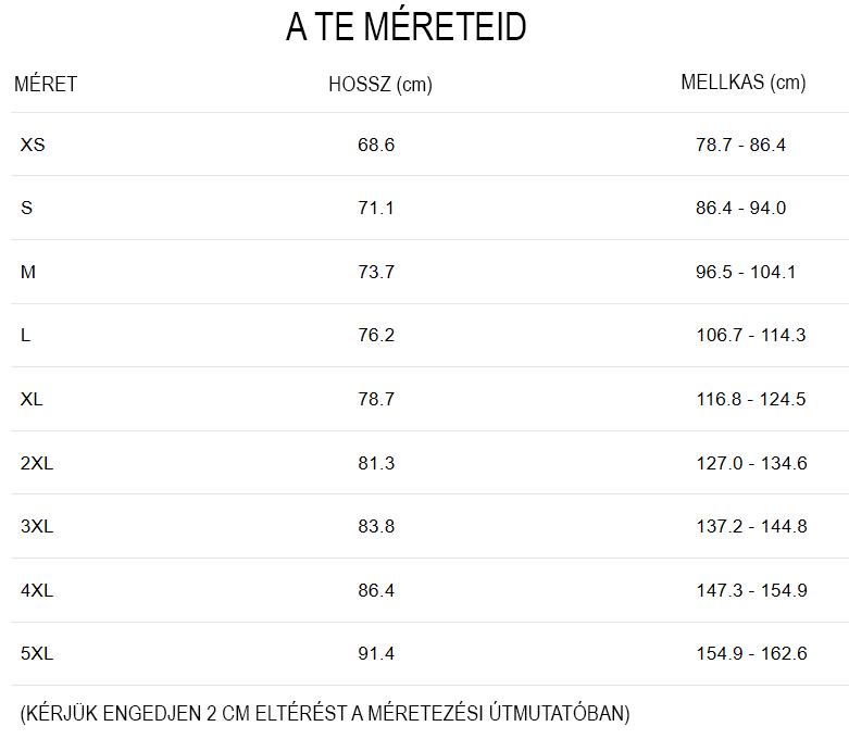 Némi eltérés előfordulhat, a póló méretei legfeljebb 5 cm eltéréssel változhatnak.
